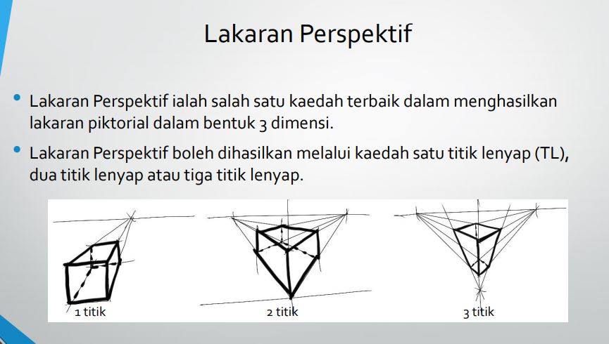 Komputer lakaran oblik lakaran isometrik lakaran perspektif 1 titik 2 titik 3 titik lakaran piktorial 1 sudut 45⁰ 2 sudut 30⁰ garisan ufuk (titik lenyap.